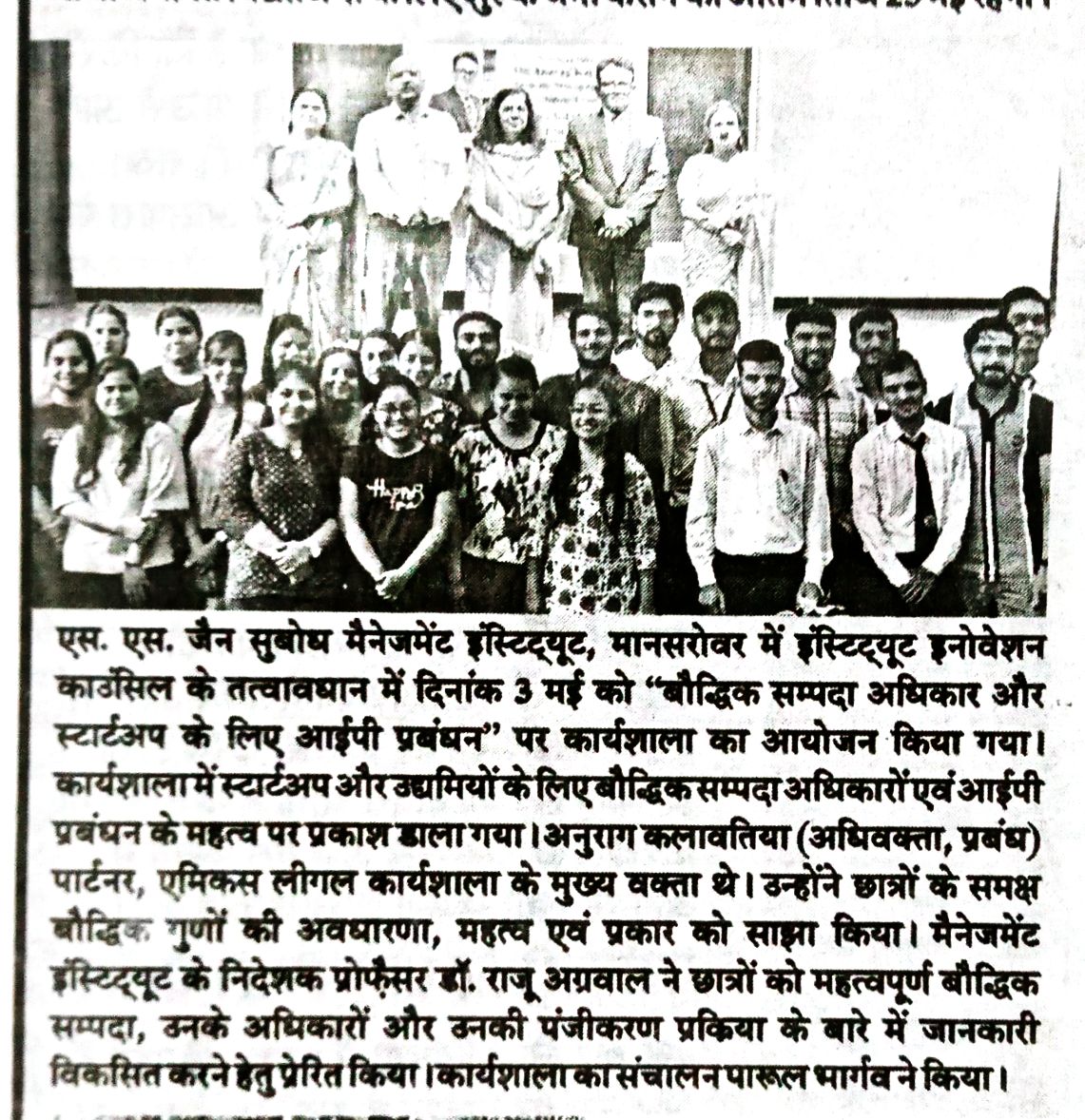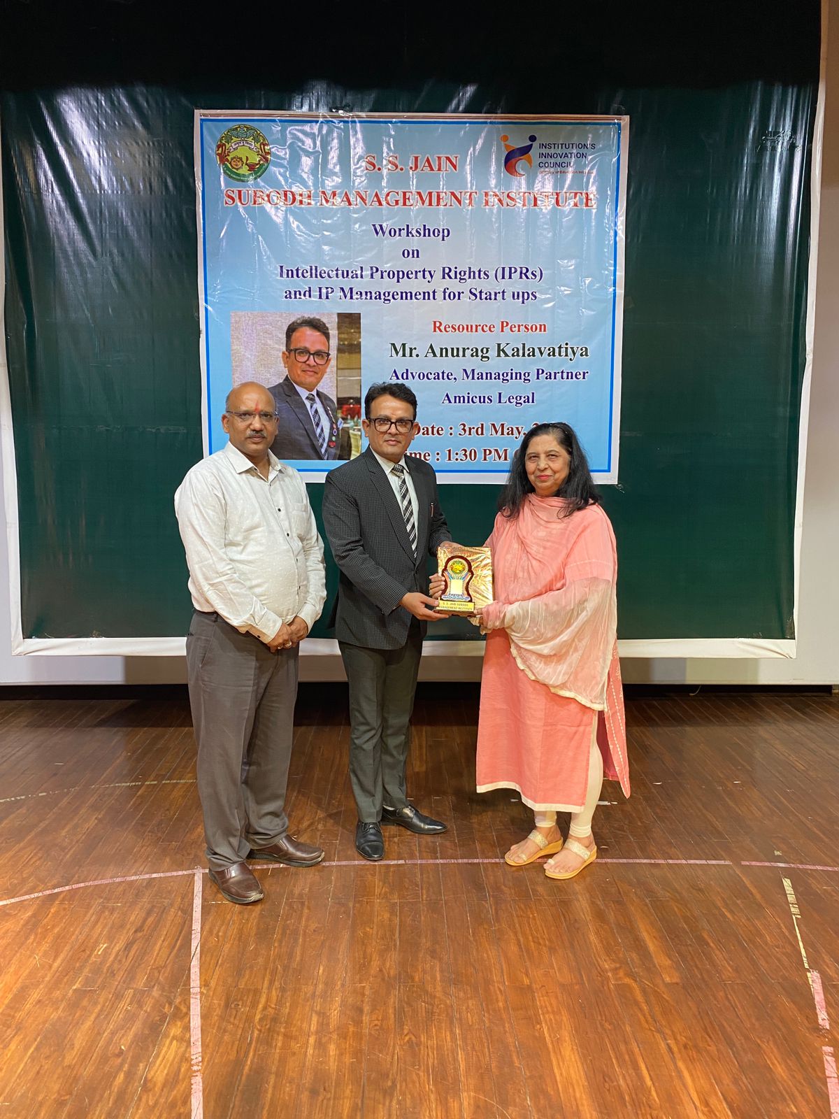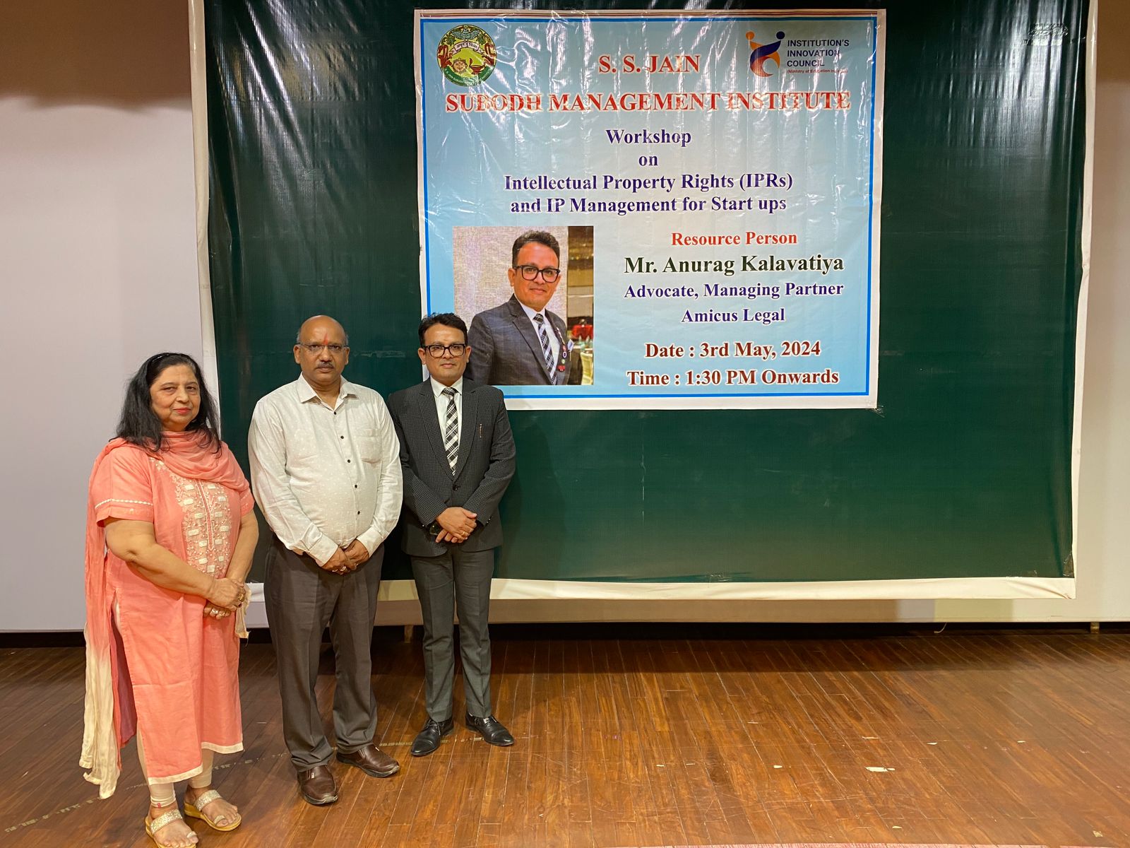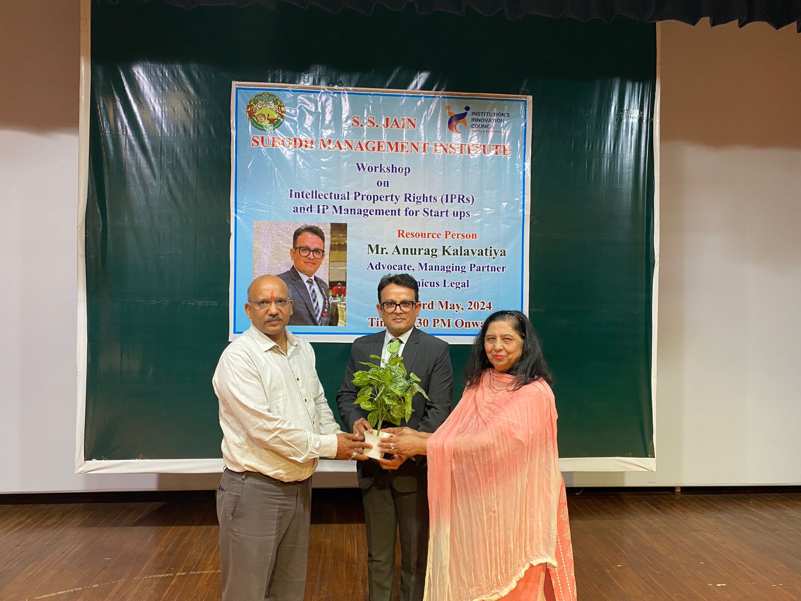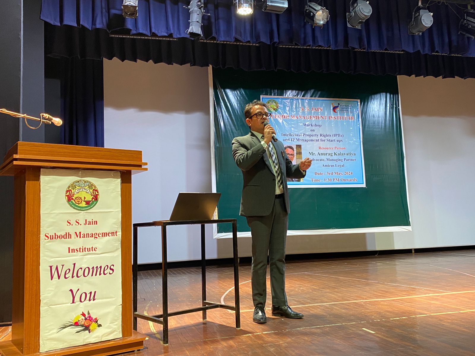 S. S. Jain Subodh Management Institute, Mansarovar under the aegis of Institute Innovation Council (IIC) organized a workshop on “Intellectual Property Rights (IPRs) and IP Management for Start-ups” on 3 rd May, 2024. Mr. Anurag Kalavatiya (Advocate, Managing Partner, Amicus Legal) was the keynote speaker for the Workshop. At the outset the students were welcomed, made aware about the objective of the workshop and the initiatives of Institution Innovation Cell. Prof. Dr. Raju Agrawal, Director, S. S. Jain Subodh Management Institute and IIC President welcomed the keynote speaker and presented him a green token of appreciation. In his speech, he motivated students to develop an insight for important intellectual property, their rights and their registration process. Intellectual property is vital to the business process. Safeguarding an entrepreneurship intellectual property is crucial to developing and maintaining a successful business. In the workshop, Mr. Kalavatiya shared the concept, importance and types of intellectual properties. He told that it is important for anyone to protect his or her ideas. For entrepreneurs, it is essential to safeguard this investment. Intellectual Property (IP) systems can be critical in helping new ventures transform their innovation potential and creativity into market value and competitiveness.IPR safeguards the ideas and innovations of entrepreneurs, ensuring that their original works and inventions are protected from potential infringement and unauthorized use. This protection is crucial for fostering a conducive environment for creativity and innovation. The workshop was coordinated by Parul Bhargava (IIC member). IIC Coordinator Kaneenika Jain proposed the vote of thanks. The workshop highlighted the importance of intellectual property rights and IP Management for start-ups and entrepreneurs. More than 85 students and faculty members participated in the workshop.